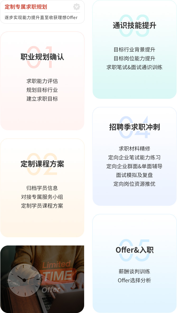 分析不同岗位特点,进行面试前指导,根据不同的面试岗位安排不同的视频课程 |